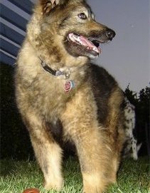 Sacchetto the Coydog (domestic dog / coyote hybrid) was found abandoned and left to die in a plastic bag when she was only 2 months old. Her owner says, "A young couple walking their dog (an Afghan) in West LA passed by a moving plastic bag in the road and checked it out and found her. Sacchetto means "little bag" in Italian (often little plastic bag). Here in Los Angeles apparently it's a big thing to bring your female shepherd who is in heat up to the Hollywood hills and leave her there tied up so she will mate with a male coyote. She has the total personality of a coyote—though not the piercing eyes. She is EXTREMELY shy and timid of ANYONE but me. Her back legs sort of go off to the side when she runs, as do coyotes. She is smarter than she is even aware of. I can't even explain it, but she is very intelligent. I also have a Doberman who is very smart, too, but nothing compared to Sacchetto. Unfortunately, she seems to have taken on the hips of the German Shepherd in her, as she was diagnosed with severe degenerative hip disease this past December. Acupuncture is helping a lot, so is the raw food diet I just switched all of them on to. My holistic/Western vet suggested that due to the coyote in her, she would probably do very well on the raw food diet. So I've switched them all (I have a pack of 4)."